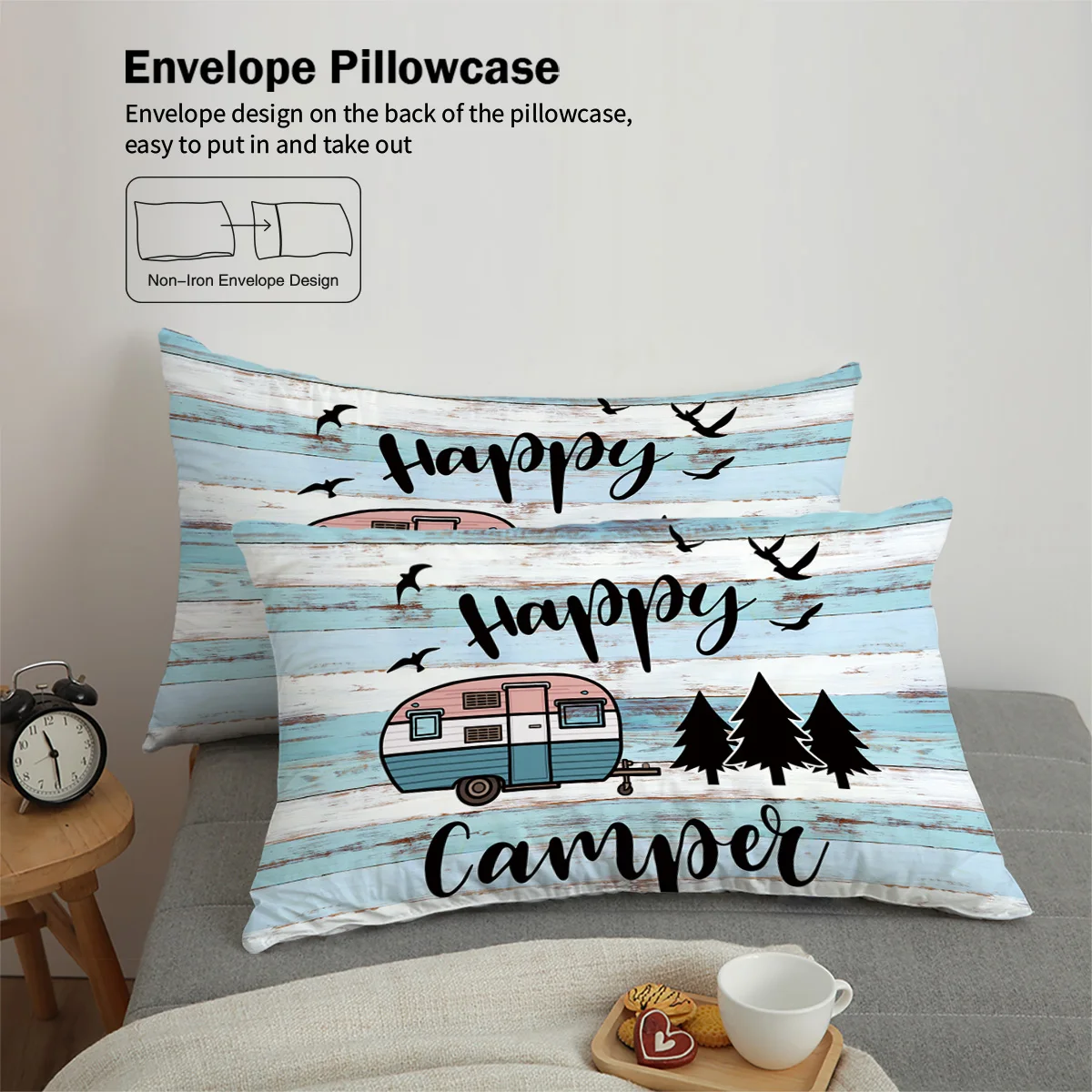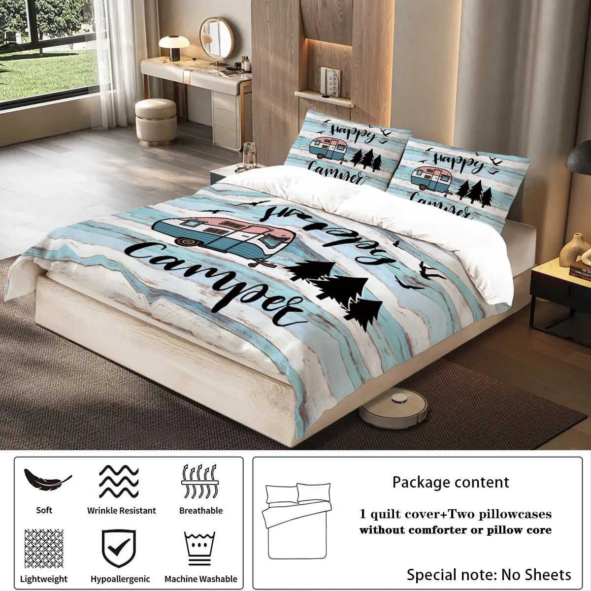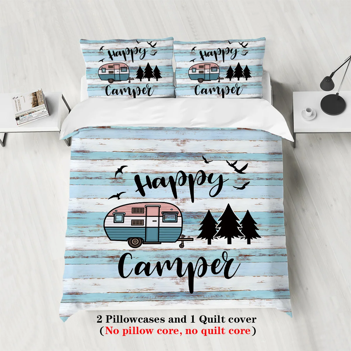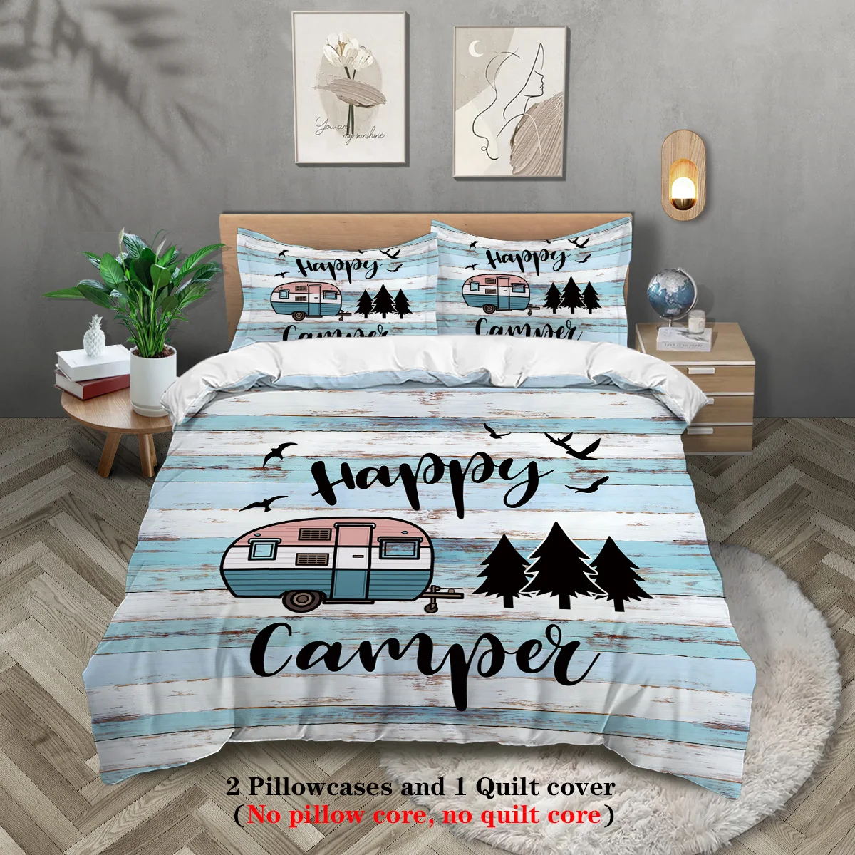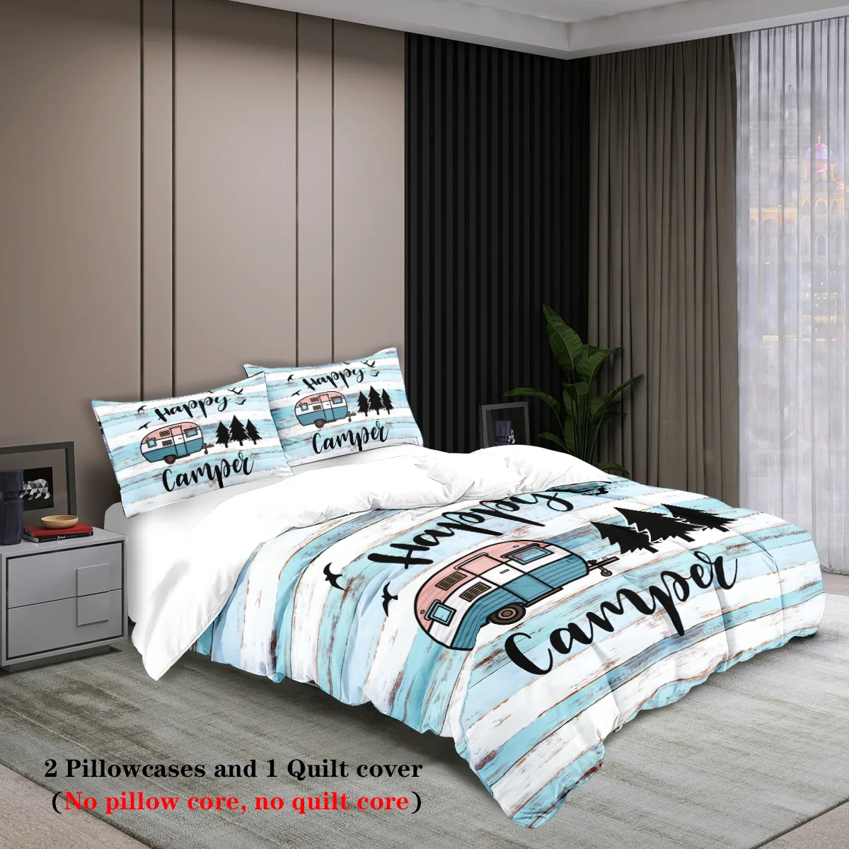 3pcs happy camper pattern printed bedding set, suitable for teenagers and adult’s bedroom, camping, 1*duvet cover+2*pillowcase